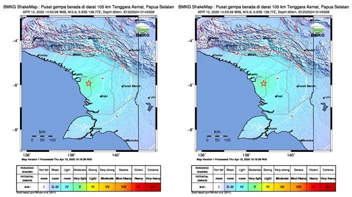 JAKARTA — Gempa bumi tektonik berkekuatan Magnitudo (M) 5,9 mengguncang wilayah Asmat, Papua Selatan, pada Kamis (10/4/2025) pukul 14.53 WIB.