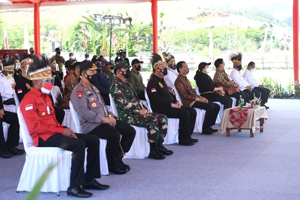 PAPUA – Panglima TNI Marsekal TNI Hadi Tjahjanto dan Kapolri Jenderal Pol Listyo Sigit Prabowo mendampingi Presiden Joko Widodo (Jokowi) meresmikan tujuh arena pertandingan yang akan digunakan dalam perhelatan Pekan Olahraga Nasional (PON) XX Papua 2021 . Peresmian yang ditandai dengan penandatanganan prasasti tersebut digelar di Istora Papua Bangkit, Kabupaten Jayapura, Sabtu (2/10/2021).