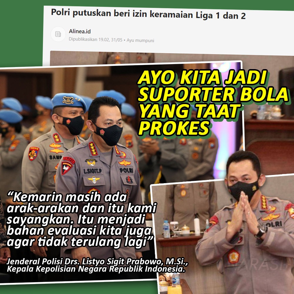 Kapolri Jenderal Listyo Sigit Prabowo berikan dukungan berlangsungnya Liga 1 dan Liga 2 2021/2022 dengan syarat penyelenggaraan liga tetap mematuhi protokol kesehatan.