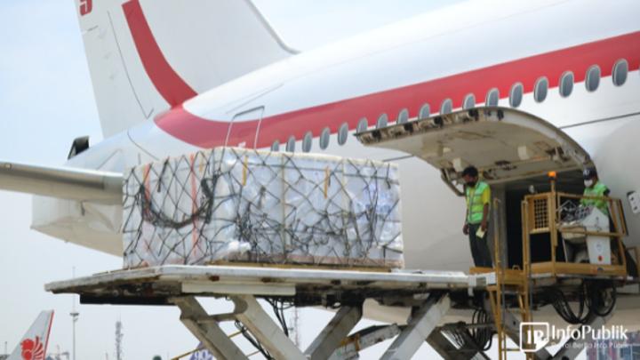 Bantuan setengah juta vaksin dari Pemerintah Persatuan EmiratArab, tiba di Bandara Internasional Soekarno Hatta, Jakarta, Sabtu, 1 Mei 2021. Vaksin produksi Sinopharm, asal dari Tiongkok tersebut tiba menggunakan pesawat Garuda Indonesia GA-891. Foto/Kominfo